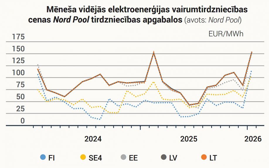 Lietuvā vidējā elektroenerģijas cena palielinājās par 82%, sasniedzot 152,47 eiro par MWh, bet Igaunijā vidējā elektroenerģijas cena pieauga par 110% un sasniedza 154,44 eiro par MWh.