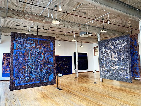 – Kādubrīd mani interesēja arī objekti, ko veidoju no mikroshēmu platēm, un savulaik tie tika izstādīti Rīgas galerijā. Tagad es šo tēmu esmu pārvērtis mikroshēmu dizaina interpretācijās. Darbi no sērijas “Transfigurācijas” ir šo mikroshēmu ideju pārveidojumi – tā ir interpretācija. Es mēģinu pateikt, ka tas ir divdesmitā gadsimta beigu un divdesmit pirmā gadsimta sākuma ornaments – mūsdienu simboli un zīmes. Es vēlējos atrast kaut ko patiesi raksturīgu mūsu laikmetam. Šajos darbos var redzēt kontekstu, kā idejas ir transformējušās no mikroshēmu platēm. Es centos to izveidot kā mūsdienām raksturīgu ornamentu. Spriežot pēc atsauksmēm, ko saņēmu Kanādā, šķiet, ka mūsdienu cilvēkiem tas patīk. Līdz ar to sāku izmantot arī mūsdienīgus materiālus – video lentes un dažādus sintētiskos materiālus, piemēram, polipropilēnu, ko plaši lieto rūpniecībā, un poliesteri, kas šodien ir visur. Tas ir galvenais materiāls, kas daudzviet aizstājis vilnu, linu un citus tradicionālos materiālus.