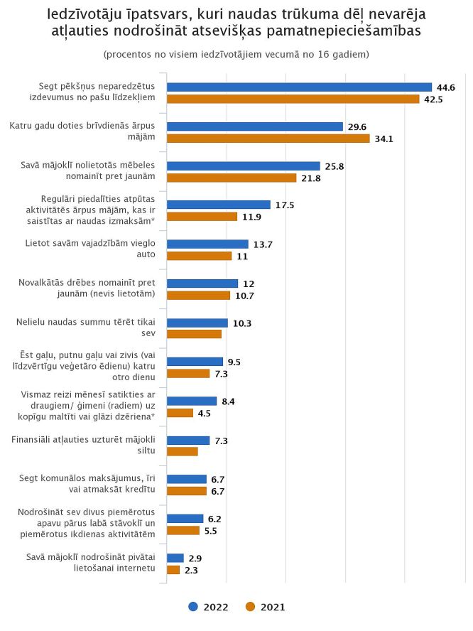 Pērn 58,1 % Latvijas iedzīvotāju vecumā no 16 gadiem nevarēja atļauties nodrošināt vismaz vienu no 13 pamatnepieciešamībām (2021.gadā – 59,3 %). Segt pēkšņus neparedzētus izdevumus nevarēja atļauties 44,6 % iedzīvotāju (2021. gadā – 42,5 %), katru gadu vienu nedēļu doties brīvdienās ārpus mājām – 29,6 % (2021. gadā – 34,1 %) un savā mājoklī nolietotās mēbeles nomainīt pret jaunām – 25,8 % (2021. gadā – 21,8 %). Uzturēt mājokli siltu nevarēja atļauties 7,3 %, segt komunālos maksājumus, īri vai atmaksāt mājokļa kredītu – 6,7 %.