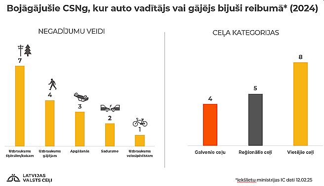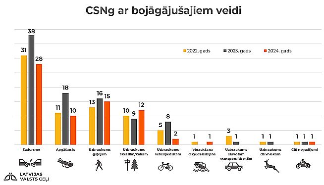 Visvairāk CSNg bojāgājušo pagājušajā gadā, tāpat kā iepriekšējos gados, bija sadursmēs – 28 cilvēki (2023. gadā tie bija 38). Pērn 15 cilvēki gāja bojā uzbraukumā gājējiem (2023. gadā – 16); 12 cilvēki gāja bojā uzbraukumos šķērslim (2023. gadā – deviņi); desmit cilvēki gāja bojā transportlīdzekļu apgāšanās rezultātā (2023. gadā – 18).