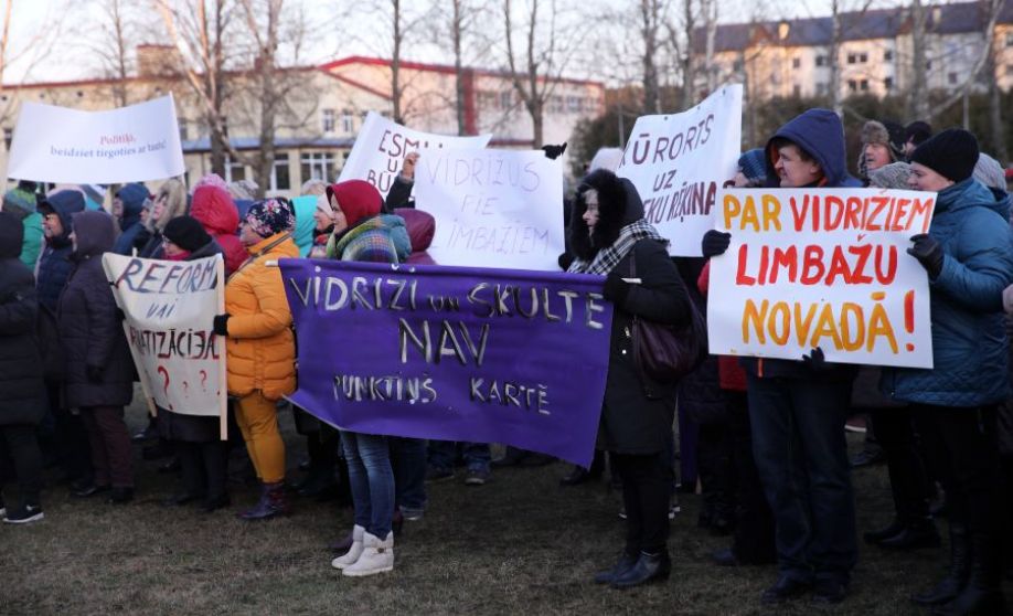 Cilvēkiem rokās ir vairāki plakāti, uz kuriem rakstīti saukļi "Saulkrastu novadam - nē!", "Nē - Dombravas novadam!", "Politiķi, beidziet tirgoties ar tautu!", "Par Vidrižiem Limbažu novadā!", "Vidriži un Skulte nav punktiņš kartē!", "Reforma vai privatizācija?" un citi.