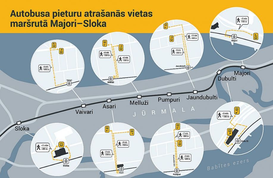 Autobusa pieturas Majoros būs Lienes ielā, Dubultos – Zigfrīda Meierovica prospektā, Jaundubultos Tukuma virzienā pietura būs Dubultu prospektā, bet Rīgas virzienā – Strēlnieku prospektā, Pumpuros Tukuma virzienā pietura būs Dubultu prospektā, bet Rīgas virzienā – Strēlnieku prospektā, Mellužos – Mellužu prospektā, Asaros – Asaru prospektā, Vaivaros būs pieturvietās NRC ”Vaivari”, Asaru prospektā, savukārt Slokā atradīsies pie stacijas ēkas.
