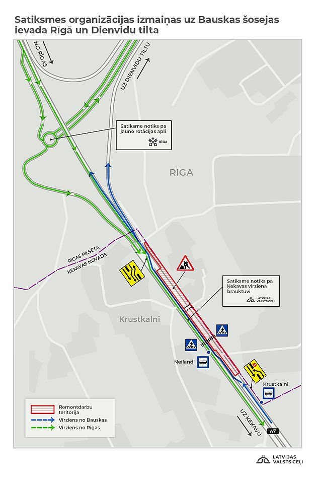 Pie Bauskas šosejas (A7) ievada Rīgā turpinās gājēju un velosipēdistu infrastruktūras būvdarbi, kurus organizē VSIA “Latvijas Valsts ceļi” (LVC), kā arī Dienvidu tilta 4. kārtas izbūve, ko organizē Rīgas pašvaldība. Tuneļa būvdarbi zem Bauskas šosejas ievada Ķekavas virziena brauktuves ir pabeigti tādā apmērā, lai varētu pārslēgt satiksmi tuneļa zonā no kreisās brauktuves uz labo brauktuvi, un būvnieki turpinās darbus zem Rīgas virziena brauktuves, ar ko saistītas izmaiņas satiksmes organizācijā.