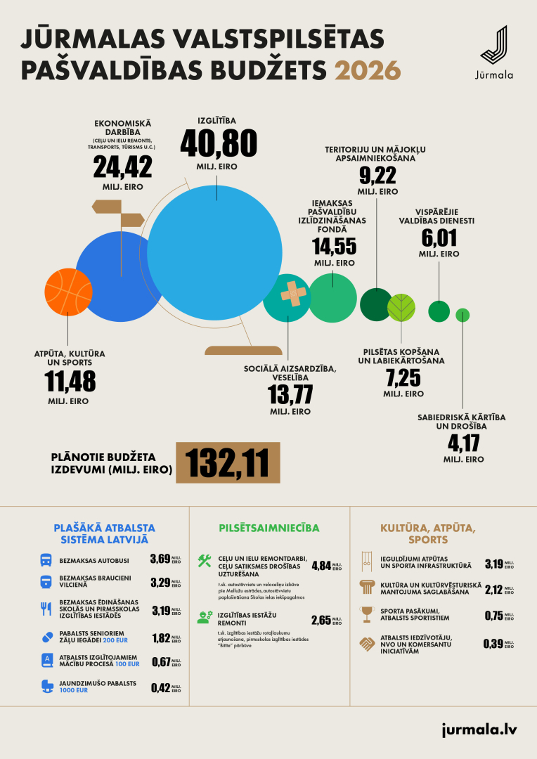 Kā vēsta valstspilsētas administrācijā, veidojot 2026. gada budžetu, galvenā uzmanība tika pievērsta tam, lai saglabātu un paplašinātu pašvaldības noteiktos atvieglojumus, sociālās garantijas un pabalstus Jūrmalā deklarētajiem iedzīvotājiem.