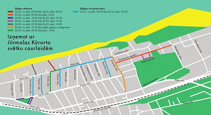 Kūrorta svētku laikā Jūrmalā noteikti satiksmes ierobežojumi, būs izmaiņas sabiedriskā transporta maršrutos. Saistībā ar Jūrmalas Kūrorta svētku norisi gaidāmi sastrēgumi pie iebraukšanas Jūrmalā un pilsētā. Autobraucējiem jārēķinās, ka automašīnu novietošana pilsētā būs apgrūtināta un veidosies sastrēgumi. Lai izvairītos no sastrēgumiem, Kūrorta svētku apmeklētāji aicināti izvēlēties citus transporta veidus nokļūšanai Jūrmalā – vilcienu, autobusus vai velosipēdus.