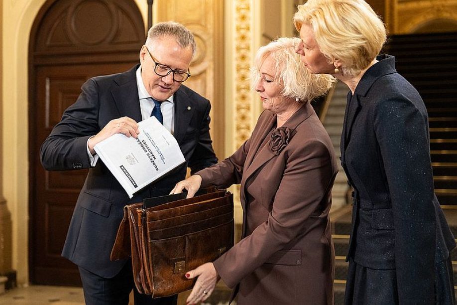 Saeimas priekšsēdētāja Daiga Mieriņa (ZZS) no finanšu ministra trešdien saņēma 2026. gada valsts budžeta projektu. Tradicionālajā budžeta portfeļa iesniegšanas pasākumā piedalījās arī Saeimas Budžeta un finanšu (nodokļu) komisijas priekšsēdētāja Anda Čakša (JV).
