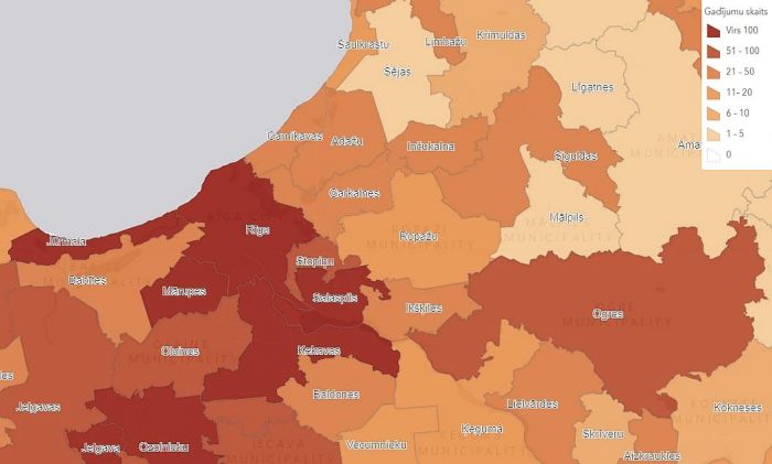 Rēķinot pēdējo 14 dienu saslimušo skaitu uz 100 000 iedzīvotājiem pēc aizvadītajā diennaktī notikušajām izmaiņām, visaugstākais tas ir Krustpils un Aknīstes novadā, Daugavpilī, Viļānu, Aglonas un Ozolnieku novadā, Jēkabpilī, Neretas un Iecavas novadā un Jelgavā.