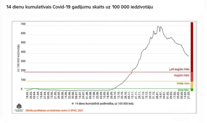 14 dienu kumulatīvais rādītājs uz 100 000 iedzīvotāju ir 370,1. Latvijā kopā saslimuši 97 586 cilvēki.