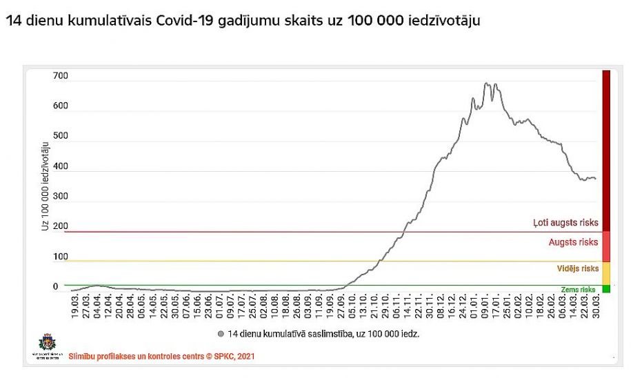 Pēc SPKC datiem, pēdējo 14 dienu laikā (līdz 30.marta pēcpusdienai) Pierīgas novados reģistrēts šāds ar Covid-19 inficēto personu skaits: Ādaži 38 (14 dienu kumulatīvā saslimstība uz 100 000 iedzīvotāju – 327), Babīte 31 (279), Baldone 12 (223), Carnikava 24 (269), Garkalne 24 (269), Ikšķile 28 (283), Inčukalns 22 (288), Krimulda 26 (541), Ķekava 76 (313), Mālpils 1-5 (90), Mārupe 56 (270), Olaine 109 (554), Ropaži 19 (278), Salaspils 94 (413), Saulkrasti 13 (193), Sēja 12 (557), Sigulda 37 (206), Stopiņi 41 (358).