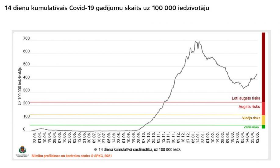 14 dienu kumulatīvais rādītājs uz 100 000 iedzīvotāju ir 441,2. Latvijā kopā saslimuši 119 953 cilvēki.
