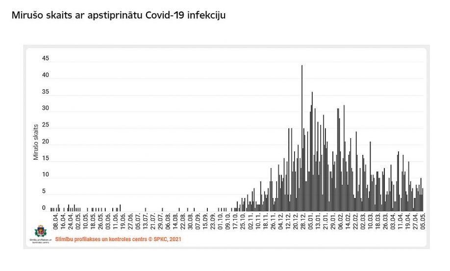 Aizvadītās diennakts laikā saņemta informācija par divpadsmit ar Covid-19 inficētiem mirušiem cilvēkiem. Viena persona bijusi vecuma grupā no 20 līdz 30 gadiem, divas grupā no 50 līdz 60 gadiem, trīs grupā no 60 līdz 70 gadiem, trīs grupā no 70 līdz 80 gadiem, divas grupā no 80 līdz 90 gadiem un viena vecuma grupā no 90 līdz 99 gadiem. Kopējais no slimības mirušo cilvēku skaits sasniedzis 2178.