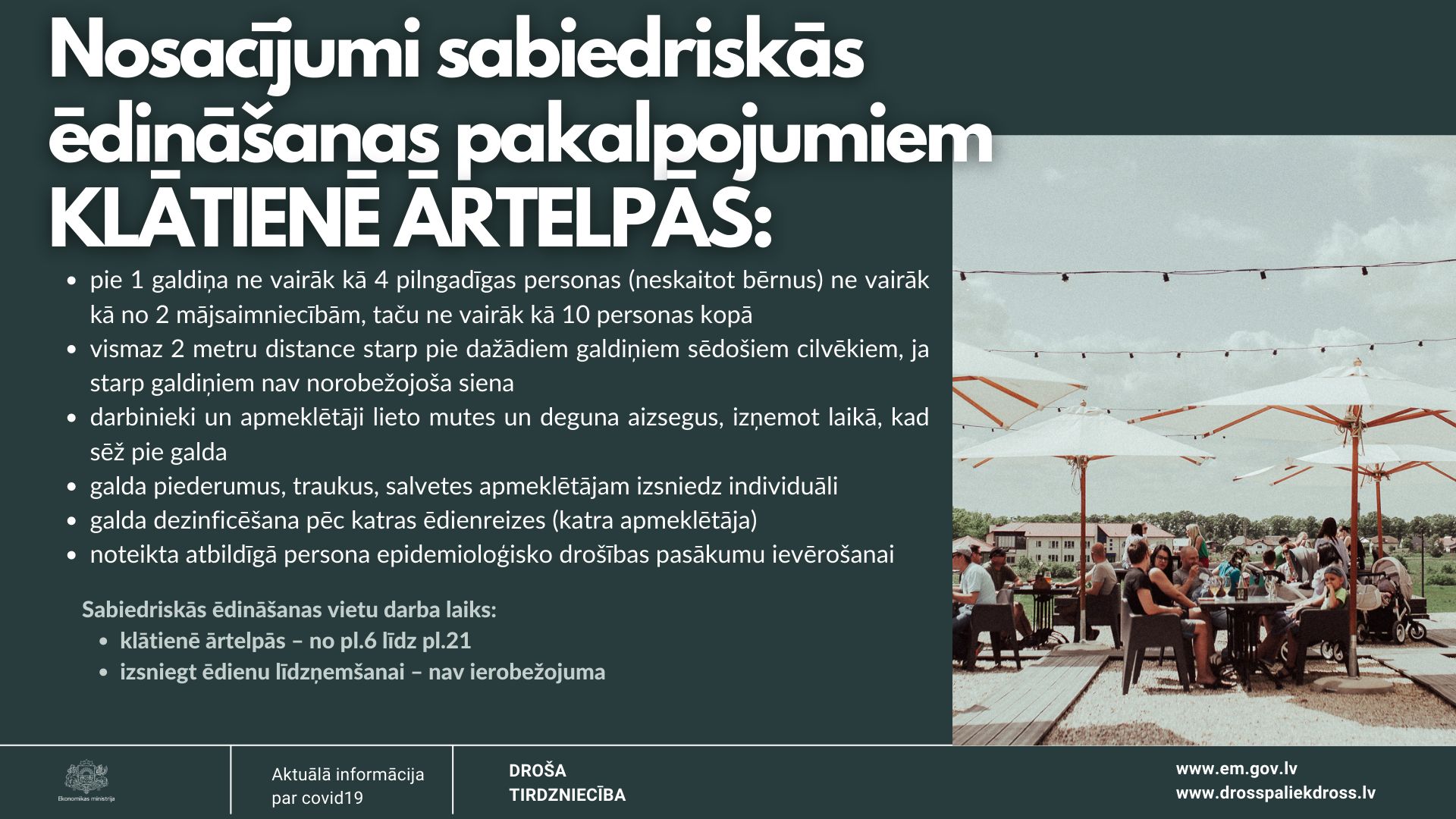 Kā informēja Ekonomikas ministrijā, lai novērstu cilvēku pastiprinātu pulcēšanos sabiedriskās ēdināšanas vietās vēlās vakara stundās, tiek noteikts ierobežojums sabiedriskās ēdināšanas vietu darba laikam klātienē ārtelpās – darbu sāk ne agrāk kā plkst. 6.00 un beidz ne vēlāk kā plkst. 21.00. Sabiedriskās ēdināšanas vietas pēc plkst. 21.00 drīkst izsniegt ēdienu tikai līdzņemšanai.