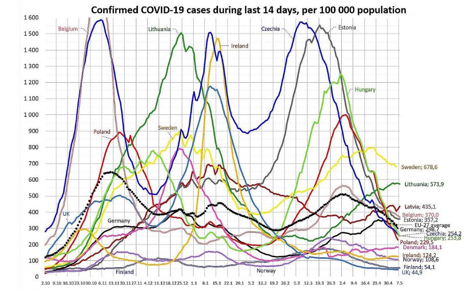 Covid-19 saslimstības 14 dienu kumulatīvais rādītājs uz 100 tūkstošiem iedzīvotāju Latvijā šobrīd ir 441,2 (pirms nedēļas – 404,1). Tikmēr Eiropas Savienības (ES) un Eiropas Ekonomikas zonas vidējais rādītājs turpina samazināties, sasniedzot 340,2 (nedēļu iepriekš – 396,0). Latvija saslimstības ziņā pakāpusies uz devīto vietu starp visām Eiropas valstīm.