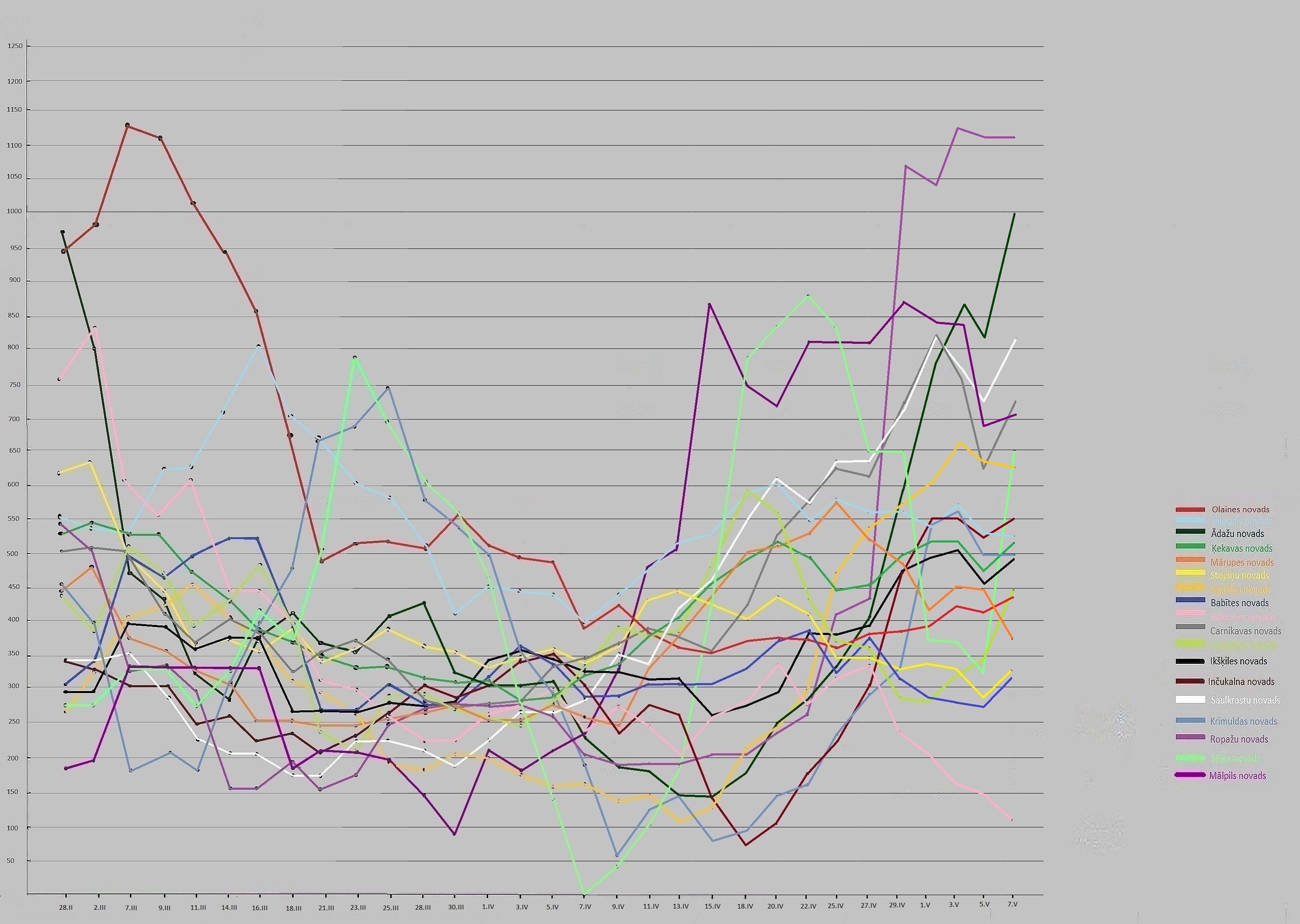 Reģistrēto Covid-19 gadījumu biežums Pierīgas novados pēdējās 14 dienās uz 100 000 iedzīvotāju: