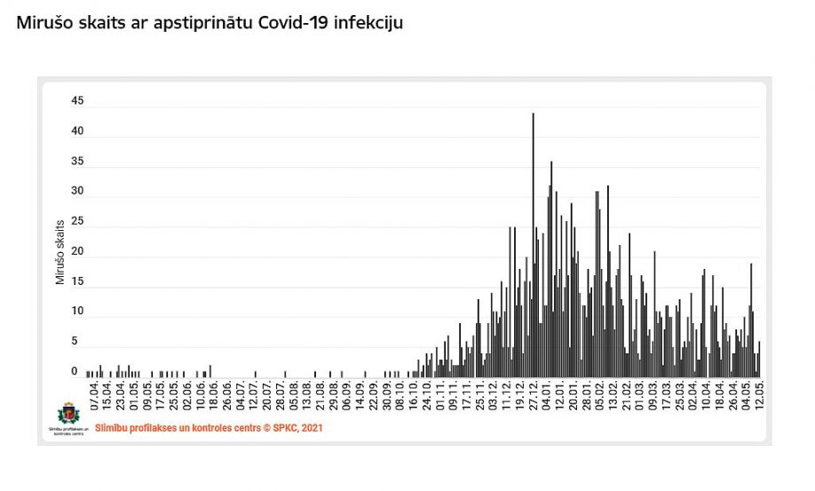 Aizvadītās diennakts laikā saņemta informācija par 17 ar Covid-19 inficētiem mirušiem cilvēkiem. Viena persona bijusi vecuma grupā no 50 līdz 60 gadiem, trīs grupā no 60 līdz 70 gadiem, sešas grupā no 70 līdz 80 gadiem, sešas grupā no 80 līdz 90 gadiem un viena vecuma grupā no 90 līdz 99 gadiem. Kopējais no slimības mirušo cilvēku skaits sasniedzis 2240.