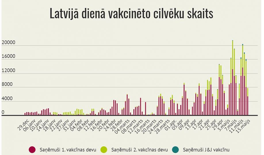 LETA jau ziņoja, ka pagājušā gada 28.decembrī kā pirmos Latvijā pret Covid-19 sāka vakcinēt lielo slimnīcu darbiniekus, bet vēlāk pakāpeniski tika atvērtas citas prioritāri vakcinējamo personu grupas. Šā gada 3.aprīlī durvis vēra speciāli izveidotie liela mēroga vakcinācijas centri, jo Latvijas rīcībā pirmo reizi bija nonācis lielāks daudzums vakcīnu. Savukārt kopš 3.maija Latvijā vakcīnu pret Covid-19, iepriekš pierakstoties, var saņemt ikviens pieaugušais, kurš to vēlas.