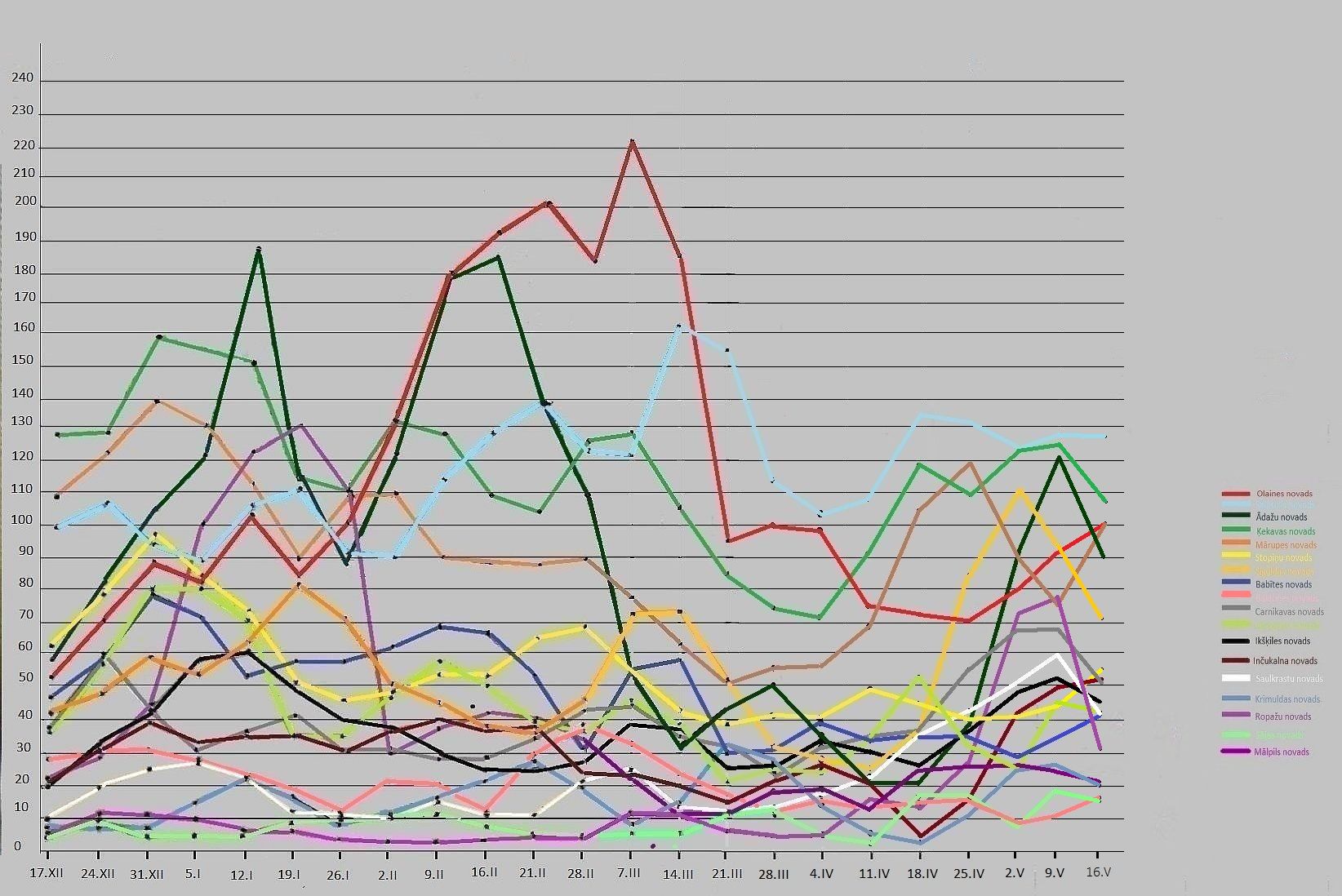 Kopējais reģistrēto saslimšanas gadījumu skaits Pierīgas novados pēdējās 14 dienās: