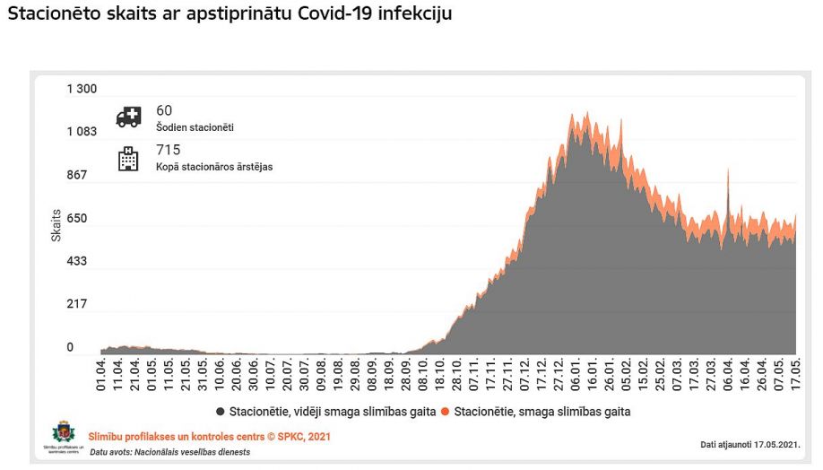 Pēdējās diennakts laikā stacionēti 60 jauni pacienti ar Covid-19, liecina Nacionālā veselības dienesta (NVD) dati. Šobrīd kopā stacionāros ārstējas 715 personas, kas ir par 47 vairāk nekā dienu iepriekš. Pacientu vidū ir 636 personas ar vidēji smagu slimības gaitu un 79 ar smagu slimības gaitu. Pēdējās diennakts laikā no stacionāra izrakstīti pieci Covid-19 pacienti – kopā 12 602.