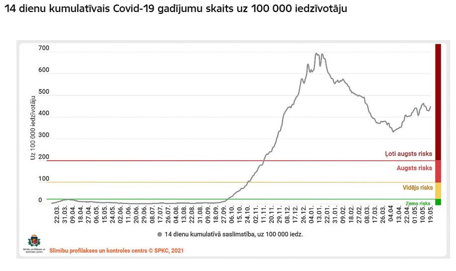 14 dienu kumulatīvais rādītājs uz 100 000 iedzīvotāju noslīdējis līdz 434,3. Latvijā kopā saslimuši 129 794 cilvēki.