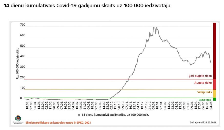 Pēdējo trīs nedēļu laikā Latvijā vērojams Covid-19 saslimstības samazinājums – pagājušajā nedēļā (20.) pret iepriekšējo nedēļu(19.) samazinājums ir par 26%, liecina Slimību profilakses un kontroles centra (SPKC) apkopotie dati. Vidēji vienā dienā tiek atklāti 424 jauni inficētie. Pagājušajā nedēļā par 2,1% samazinājies veikto testu skaits, vidēji dienā veicot 12 597 testus (iepriekš – 12 864).