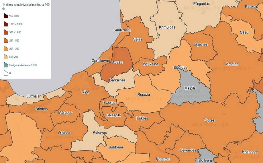 Reģistrēto Covid-19 gadījumu biežums Pierīgas novados pēdējās 14 dienās uz 100 000 iedzīvotāju: