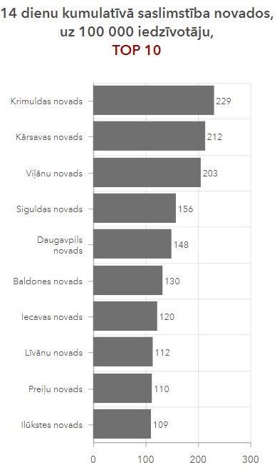 Neskatoties uz salīdzinoši lielo atklāto inficēšanās gadījumu skaitu, Covid-19 divu nedēļu kumulatīvais rādītājs uz 100 000 iedzīvotāju noslīdējis no 57,2 līdz 54,2. Pēdējo divu nedēļu laikā Latvijā konstatēti 1026 inficēšanās gadījumi ar Covid-19.