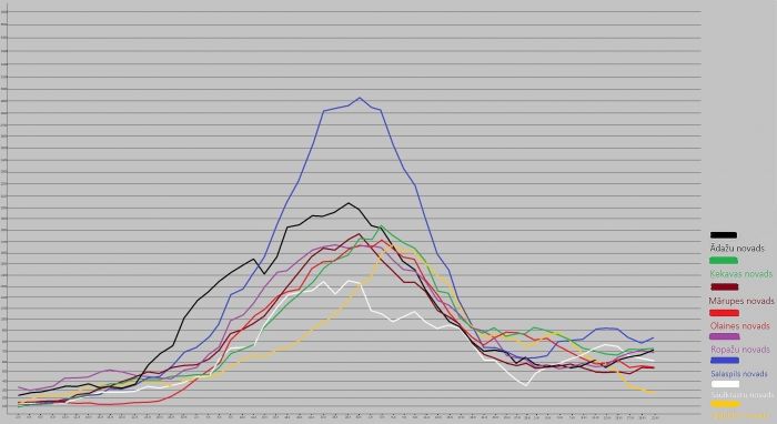 14 dienu kumulatīvais rādītājs uz 100 000 iedzīvotāju Pierīgas novados. Dati – SPKC