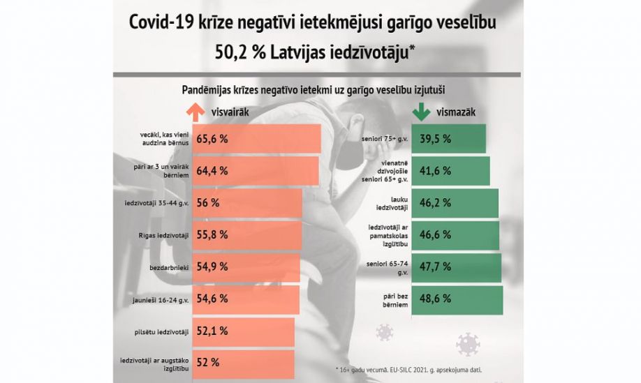 Pēc CSP datiem, visvairāk pandēmijas krīzes negatīvo ietekmi uz garīgo veselību izjutuši tie vecāki, kas vieni audzina bērnus (65,6 %) un pāri ar trim un vairāk bērniem (64,4 %), bet vismazāk – vienatnē dzīvojošie seniori vecumā no 65 gadiem (41,6 %) un pāri bez bērniem (48,6 %).