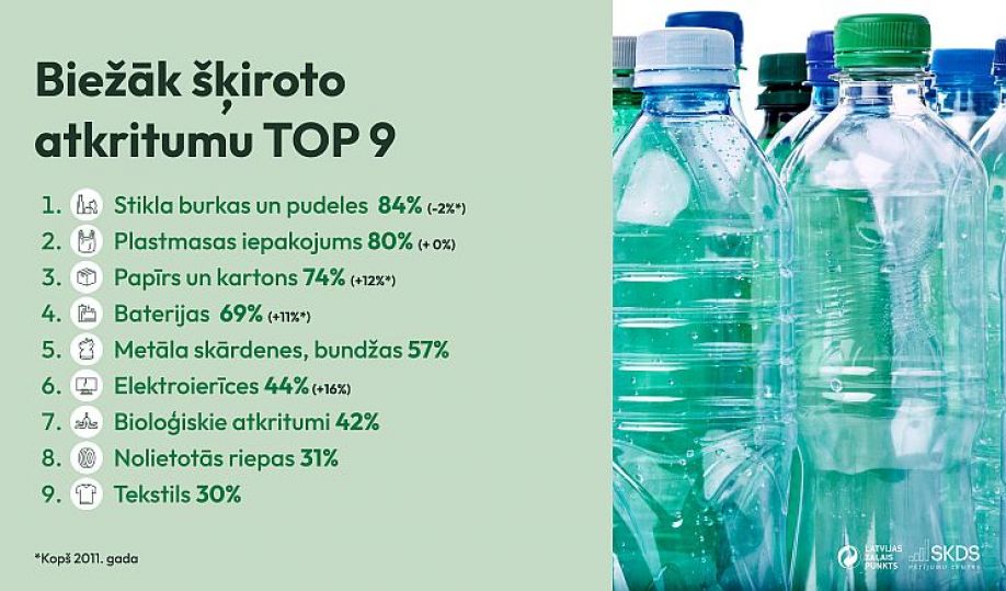 Latvijā mājsaimniecības atkritumus, tāpat kā pirms diviem gadiem, šķiro 79 % iedzīvotāju, liecina “Latvijas Zaļā punkta” aptaujas rezultāti. Līdzīgi kā iepriekšējos gados, galvenais atkritumu nešķirošanas iemesls ir nepietiekams daudzums šķirošanas konteineru, tomēr šādu atbilžu skaits ir būtiski samazinājies. Savukārt gandrīz divreiz vairāk ir kļuvis to, kuri šķiro bioloģiskos atkritumus un nevajadzīgo tekstilu.