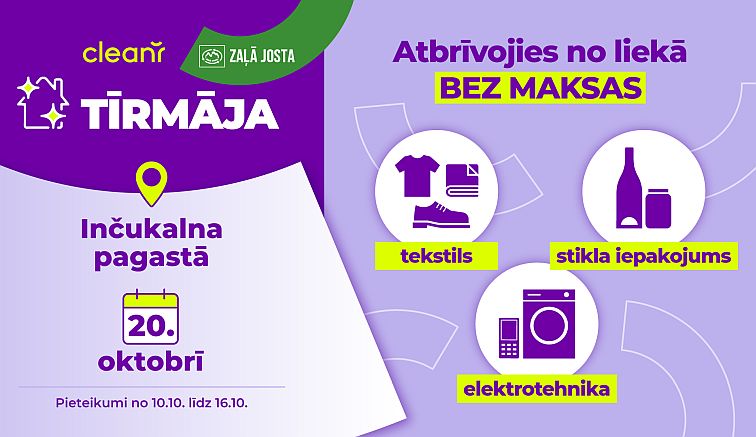 20.oktobrī Siguldas novada Inčukalna pagastā notiks akcija “Tīrmāja", kurā iedzīvotāji varēs bez maksas nodot nolietoto elektrotehniku, tekstilu un stikla iepakojumu, informē akcijas īstenotāji uzņēmumi “CleanR” un “Zaļā josta”. Lai piedalītos akcijā, Inčukalna pagasta iedzīvotājiem no 10. oktobra līdz 16. oktobrim jāpiesakās, norādot savu adresi un aptuveno atkritumu daudzumu, ko plānots nodot. Saņemot pieteikumus, “CleanR” izveidos maršrutu, lai apbraukātu katru no adresēm un savāktu norādītos atkritumus.