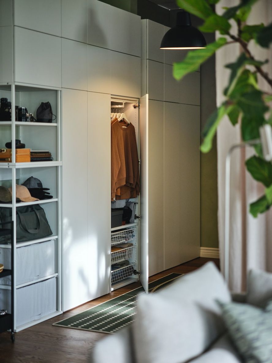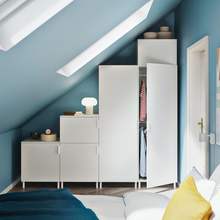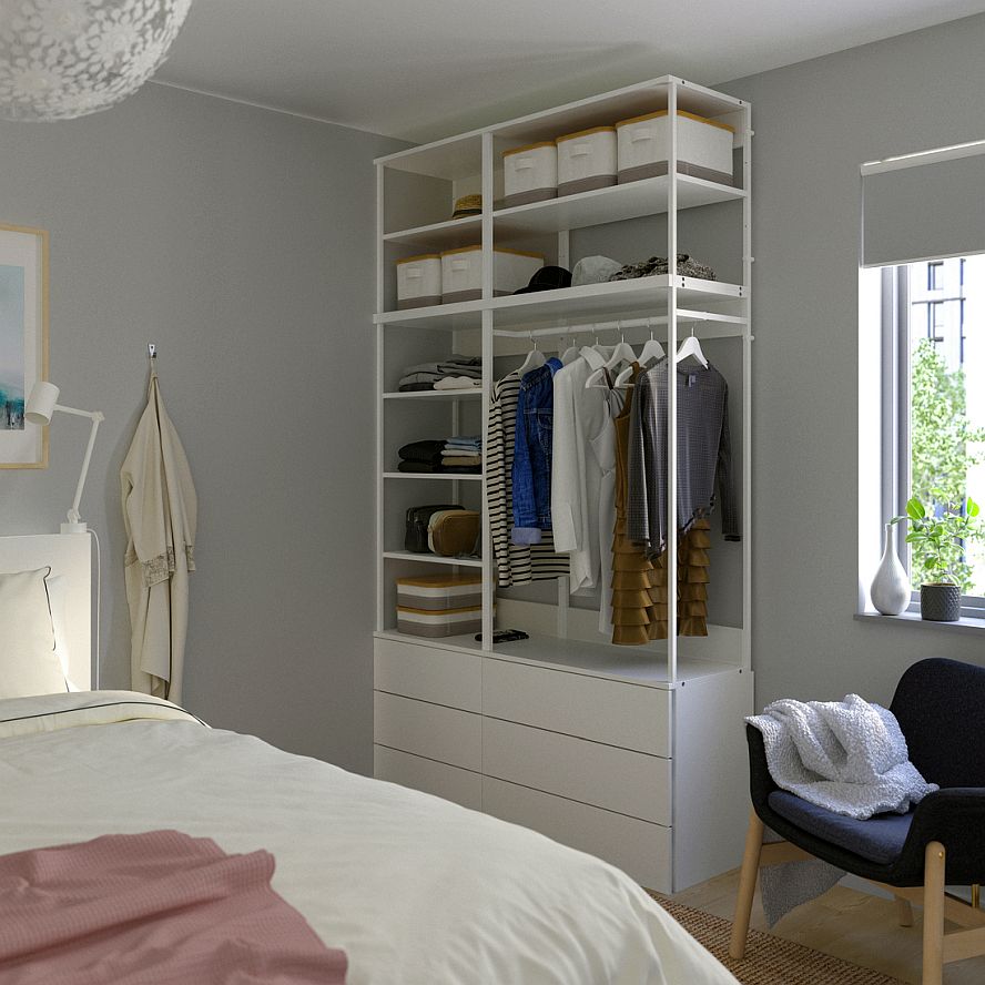 Ja skapim atvēlētā vieta ir netipiska, piemēram, telpā ir slīpie griesti vai esi iecerējis skapi izvietot visas sienas platumā, ir vērts padomāt par moduļu risinājumu. To salīdzinoši vienkārši var pielāgot specifiskām vajadzībām un vietai, kombinējot dažāda augstuma un dziļuma rāmjus. Brīvi stāvošs skapis, savukārt, ir teicama izvēle, ja mantu uzglabāšanai meklē atsevišķu mēbeli.