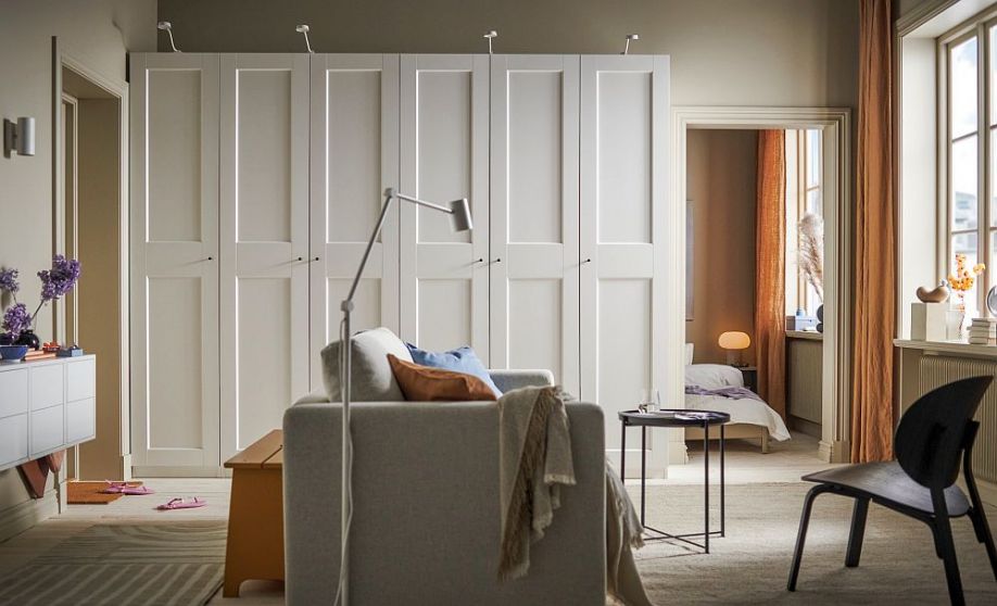 Taču īstenībā nekārtība rodas, ja ir pārāk maz vietas mantu uzglabāšanai. Drēbes un mantas pamazām sagulst uz krēslu atzveltnēm un citām virsmām, un galu galā telpa kļūst pārblīvēta un izskatās vēl mazāka. Tāpēc nav jābaidās izvēlēties lielas mēbeles, tostarp skapjus, kas aizņem visu sienu līdz pat griestiem. Ļaujot lietām atrast savu vietu skapī vai plauktā, atbrīvojas brīva vieta telpā.