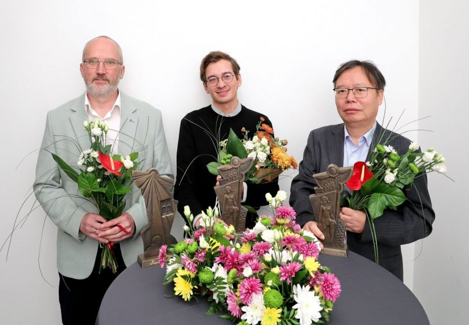 Aleksandra Čaka balvas ieguvēji (no kreisās puses – Kaspars Migla, Eriks Naivo, Liens Bins). Foto - Jānis Brencis
